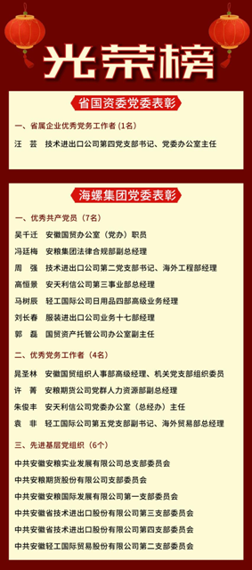 近日,省國(guó)資委黨委、海螺集團(tuán)黨委分別開展了省屬企業(yè)和集團(tuán)優(yōu)秀共產(chǎn)黨員、優(yōu)秀黨務(wù)工作者、先進(jìn)基層黨組織表彰,安徽國(guó)貿(mào)所屬技術(shù)進(jìn)出口公司汪蕓同志榮獲省屬企業(yè)優(yōu)秀黨務(wù)工作者稱號(hào),吳千遷等7名同志榮獲集團(tuán)優(yōu)秀共產(chǎn)黨員稱號(hào),晁圣林等4名同志榮獲集團(tuán)優(yōu)秀黨務(wù)工作者稱號(hào),安糧實(shí)業(yè)公司黨總支等6個(gè)基層黨組織榮獲集團(tuán)先進(jìn)基層黨組織稱號(hào)。