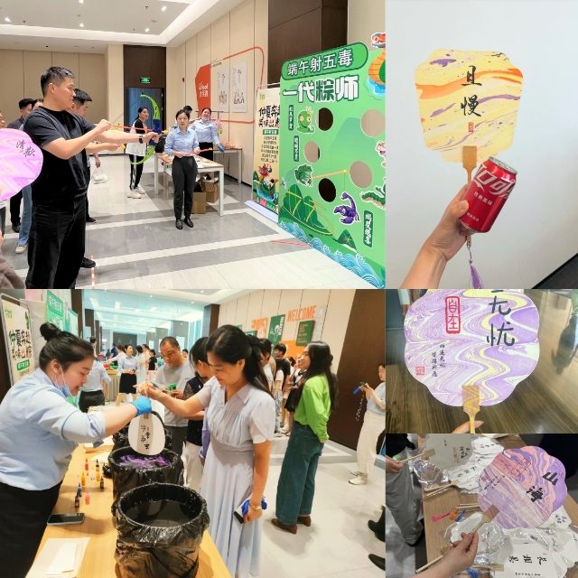 5月29日,在公司餐廳開展的“仲夏奔赴?美味出粽”端午趣味活動,吸引了眾多員工熱情參與?;顒蝇F(xiàn)場最具人氣的“端午射五毒”游戲,參與者手持弓箭瞄準(zhǔn)背景板上的蛇、蝎等“五毒”圖案,在體驗傳統(tǒng)民俗競技樂趣的同時,寄托驅(qū)邪避毒、祈福安康的心愿。同步開展的非遺漆扇制作活動讓員工通過親手創(chuàng)作進(jìn)一步深化對非遺文化的認(rèn)知。成品扇子上,“山海”“無憂”“且慢”等字樣與端午元素、傳統(tǒng)書法相映成趣。