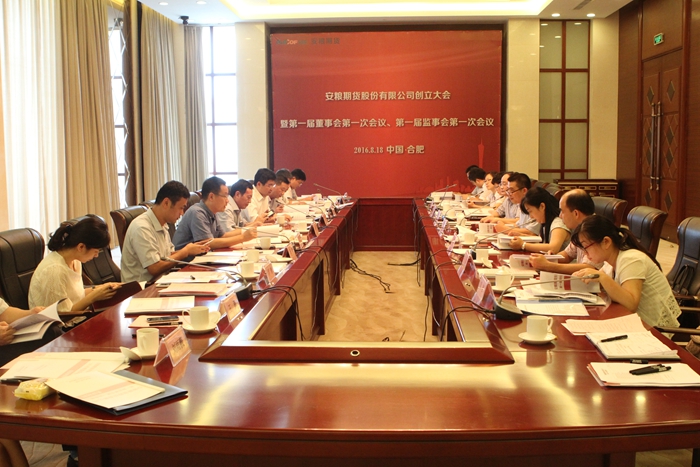2016年8月18日,安糧期貨股份有限公司創(chuàng)立大會暨第一屆董事會第一次會議、第一屆監(jiān)事會第一次會議在稻香樓賓館徽苑巢湖廳隆重召開。公司股東單位領(lǐng)導及股東代表,安糧期貨經(jīng)營管理層等相關(guān)人員出席了會議。大會審議通過了《安糧期貨股份有限公司籌辦情況報告》、《安糧期貨股份有限公司章程》、《安糧期貨股份有限公司股東大會議事規(guī)則》等13個議案,審議通過了安糧期貨股份有限公司第一屆董事會、監(jiān)事會、經(jīng)營管理層人選。