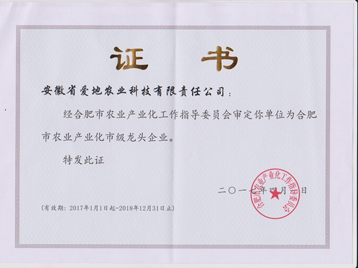 愛(ài)地農(nóng)業(yè)榮獲“合肥市農(nóng)業(yè)產(chǎn)業(yè)化市級(jí)龍頭企業(yè)”稱號(hào)