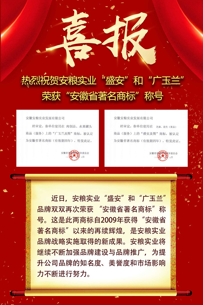 熱烈祝賀安糧實業(yè)“盛安”和“廣玉蘭“ 榮獲“安徽省著名商標”稱號