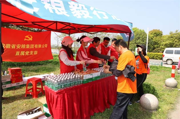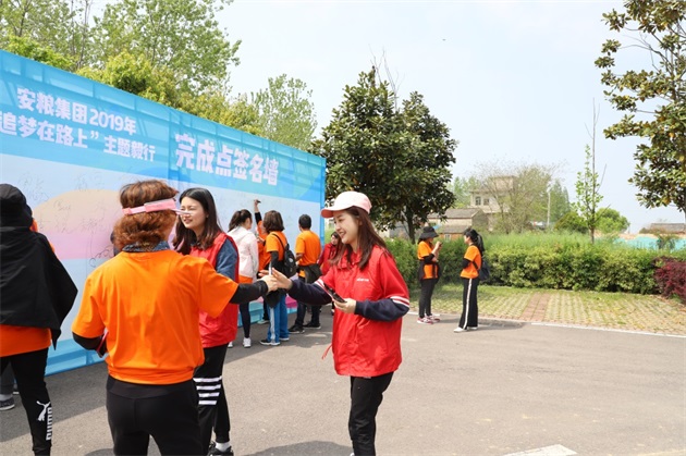 一路上,統(tǒng)一著裝的毅行隊伍如一股橙色的春潮,激蕩在碧波萬頃、楊柳接岸的巢湖之濱。伴著融融春日,吹著習(xí)習(xí)微風(fēng),毅行隊伍一邊暢享行走的樂趣,一邊欣賞大美巢湖的秀麗春色,一邊笑談工作或生活的點滴。上午10點5分,來自安糧實業(yè)的薛寶第一個沖破終點線,隨后,其他毅行者也陸續(xù)抵達終點。大家在留言墻上簽名并合影留念,一張張笑臉洋溢著成功的喜悅。