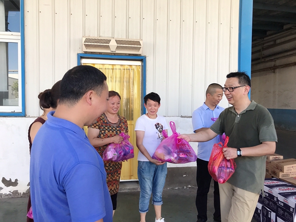 范陽董事長一行先后考察了蟹粉、糖水板栗生產(chǎn)車間、機房和冷庫等重要場所,不時提出意見和建議。在生產(chǎn)現(xiàn)場,范陽董事長率何傳友副總經(jīng)理、安糧集團工會主席周洪等向一線人員發(fā)放了礦泉水、仁丹、毛巾等防暑降溫用品,叮囑員工注意健康,做好防暑,同時要求安糧各級領導和職能部門,一定要千方百計地做好防暑降溫和后勤保障工作,確保一線員工的工作安全和身體健康。