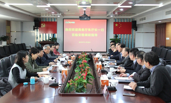 11月28日,安徽省商務(wù)廳朱丹副廳長(zhǎng)到公司開展外貿(mào)工作調(diào)研,一同調(diào)研的有省商務(wù)廳貿(mào)發(fā)處、貿(mào)管處、產(chǎn)業(yè)處相關(guān)領(lǐng)導(dǎo)。國(guó)貿(mào)集團(tuán)黨委書記、董事長(zhǎng)范陽率安糧集團(tuán)領(lǐng)導(dǎo)班子及貿(mào)易板塊主要負(fù)責(zé)人參加調(diào)研座談。