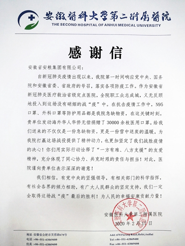 捐贈(zèng)儀式上,安醫(yī)大二附院黨委副書記高長(zhǎng)林親自將感謝信交到安糧實(shí)業(yè)黨支部書記、董事長(zhǎng)吳國(guó)杰手中,正如安醫(yī)大二附院的感謝信中所寫“這不僅僅是一份急缺物資,更是一份雪中送炭的溫暖”,作為安徽省內(nèi)大型的專業(yè)進(jìn)出口貿(mào)易企業(yè),安糧實(shí)業(yè)為疫情防控做力所能及的事情是榮幸,更是一種責(zé)任,相信眾志成城,共克時(shí)艱,這場(chǎng)疫情阻擊戰(zhàn)就一定能夠打贏!