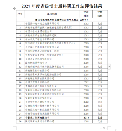 為加強(qiáng)博士后科研工作站建設(shè),推動(dòng)博士后事業(yè)科學(xué)健康發(fā)展,安徽省人社廳對(duì)全省108家2021年度設(shè)站滿3年和首次評(píng)估滿5年的省級(jí)博士后科研工作站進(jìn)行了綜合評(píng)估。最終,合肥建工博士后科研工作站等30家單位獲省優(yōu)稱(chēng)號(hào)。