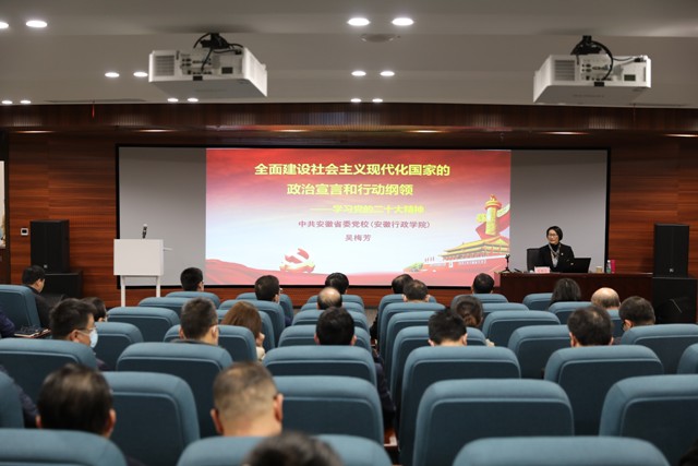 吳教授以《全面建設(shè)社會主義現(xiàn)代化國家的政治宣言和行動綱領(lǐng)——學(xué)習(xí)黨的二十大精神》為主題展開宣講,她介紹了黨的二十大召開的特殊背景和重大意義,從黨的二十大的主題和主要成果、黨的二十大報告的基本內(nèi)容和核心要義、學(xué)習(xí)宣傳貫徹黨的二十大精神三個方面,深入淺出、融會貫通地分析了本次會議提出的各項突破、首次創(chuàng)新以及細(xì)微變化背后的深刻含義,為抓好黨的二十大精神的大學(xué)習(xí)、大宣傳、大貫徹工作指明了方向、提供了思路。