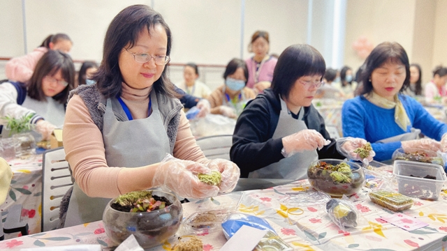 微景觀是將苔蘚、多肉等植物配以砂石、泥土、玩偶裝進容器,構成妙趣橫生的微觀世界,一個微景觀本質上也是一個小型生態(tài)系統(tǒng)。女職工們在老師的指導下開始微景觀DIY活動,大家認真構思造型,充分發(fā)揮創(chuàng)造力,不一會兒,一份份清新雅致的微景觀作品便呈現(xiàn)在大家面前。在家中、辦公室的案頭擺上一盆,勞累疲乏時抬頭瞥見那一抹綠色,仿佛跌落到一個簡單純凈的童話世界。