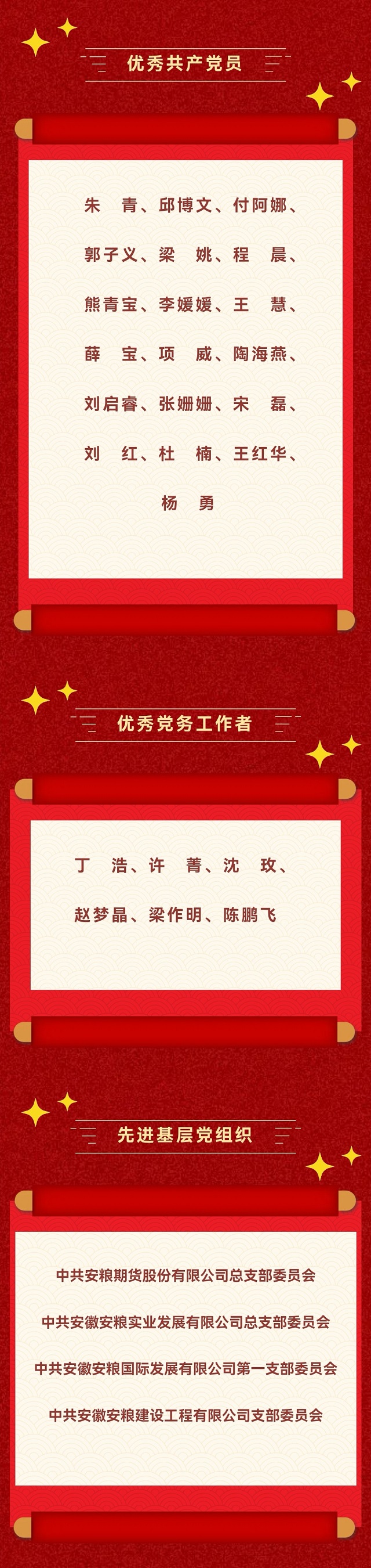 為大力弘揚(yáng)黨的優(yōu)良傳統(tǒng)和作風(fēng),激勵(lì)各級(jí)黨組織和廣大黨員更加深刻地領(lǐng)悟“兩個(gè)確立”的決定性意義,更加自覺(jué)增強(qiáng)“四個(gè)意識(shí)”、堅(jiān)定“四個(gè)自信”、做到“兩個(gè)維護(hù)”,努力營(yíng)造見(jiàn)賢思齊、爭(zhēng)做先鋒的良好氛圍。近日,安徽國(guó)貿(mào)黨委對(duì)優(yōu)秀共產(chǎn)黨員、優(yōu)秀黨務(wù)工作者和先進(jìn)基層黨組織進(jìn)行了表彰,安糧集團(tuán)19名優(yōu)秀共產(chǎn)黨員、6名優(yōu)秀黨務(wù)工作者和4個(gè)先進(jìn)基層黨組織獲得榮譽(yù)。