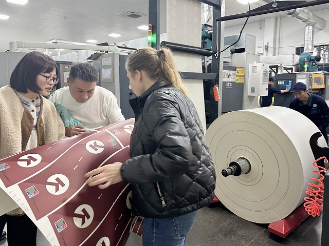 (業(yè)務(wù)員和客戶(hù)在紙杯印刷車(chē)間對(duì)紙杯印刷進(jìn)行確認(rèn))